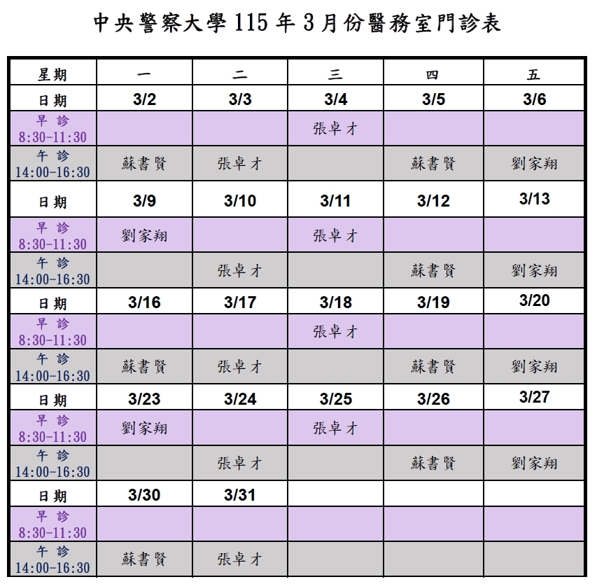 本校115年3月份醫務室門診表(如附件)供參。